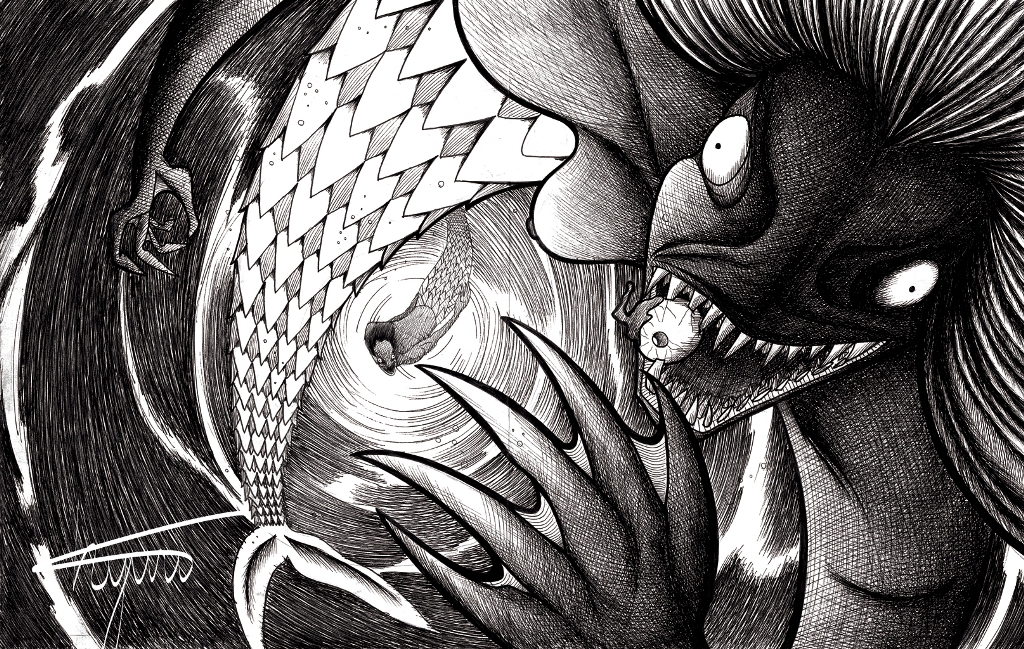 ipupiara Publicada 25/03/2016 com 1024 × 649 em O Bestiário Ilustrado de Yuri Saluceste ← Anterior Próximo → Ipupiara é uma criatura do norte, meio homem e meio peixe, que desde o Brasil Colonial assombra e mata o povo apertando em seu abraço.