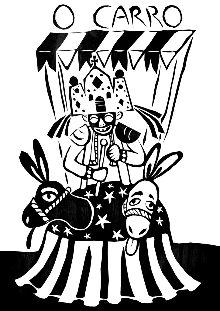O CARRO. Carta que simboliza a vitória, o triunfo, talento e competência foi representada pelo Mateus (personagem típico dos reisados – Folia de Reis, Reisado, ou Festa de Santos Reis é uma manifestação cultural religiosa festiva e classificada, no Brasil, como folclore; praticada pelos adeptos e simpatizantes do catolicismo).