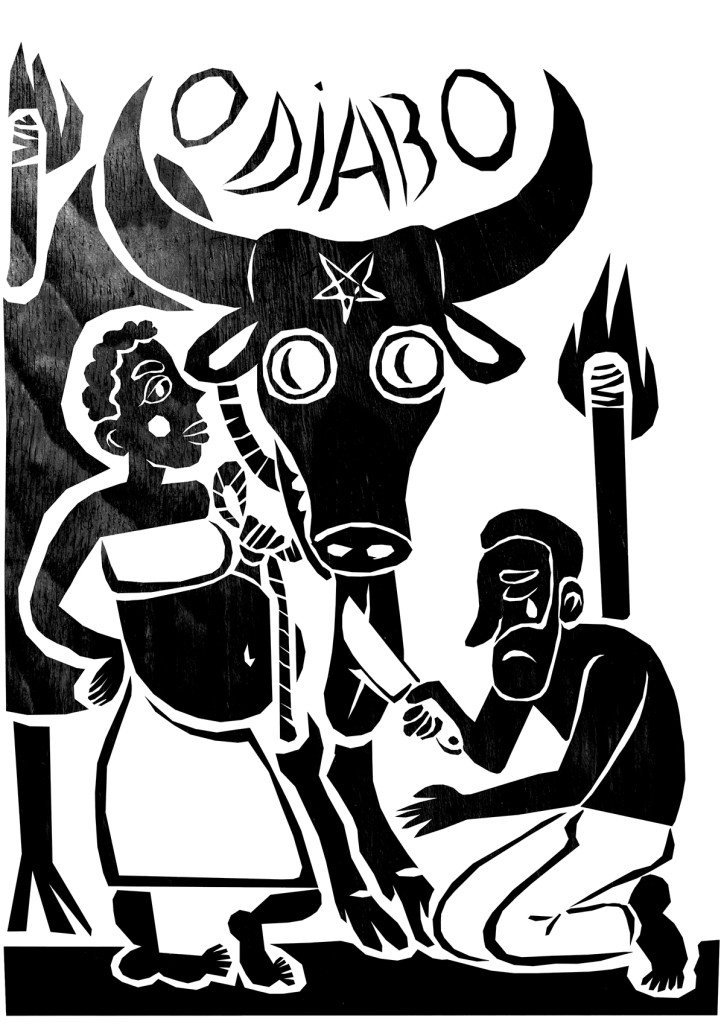 O DIABO. Figurando as tentações, provocações, a luxúria e o egoísmo temos a figura da lenda de Catirina (figura fundamental do Bumba meu boi, a escrava Catirina, grávida e desejosa, pede ao marido Chico (ou Pai Francisco) para comer língua de boi. O escravo atende ao desejo da esposa, matando o boi, e sendo preso a mando do dono da fazenda. Com a ajuda de curandeiros, o boi é então ressuscitado)