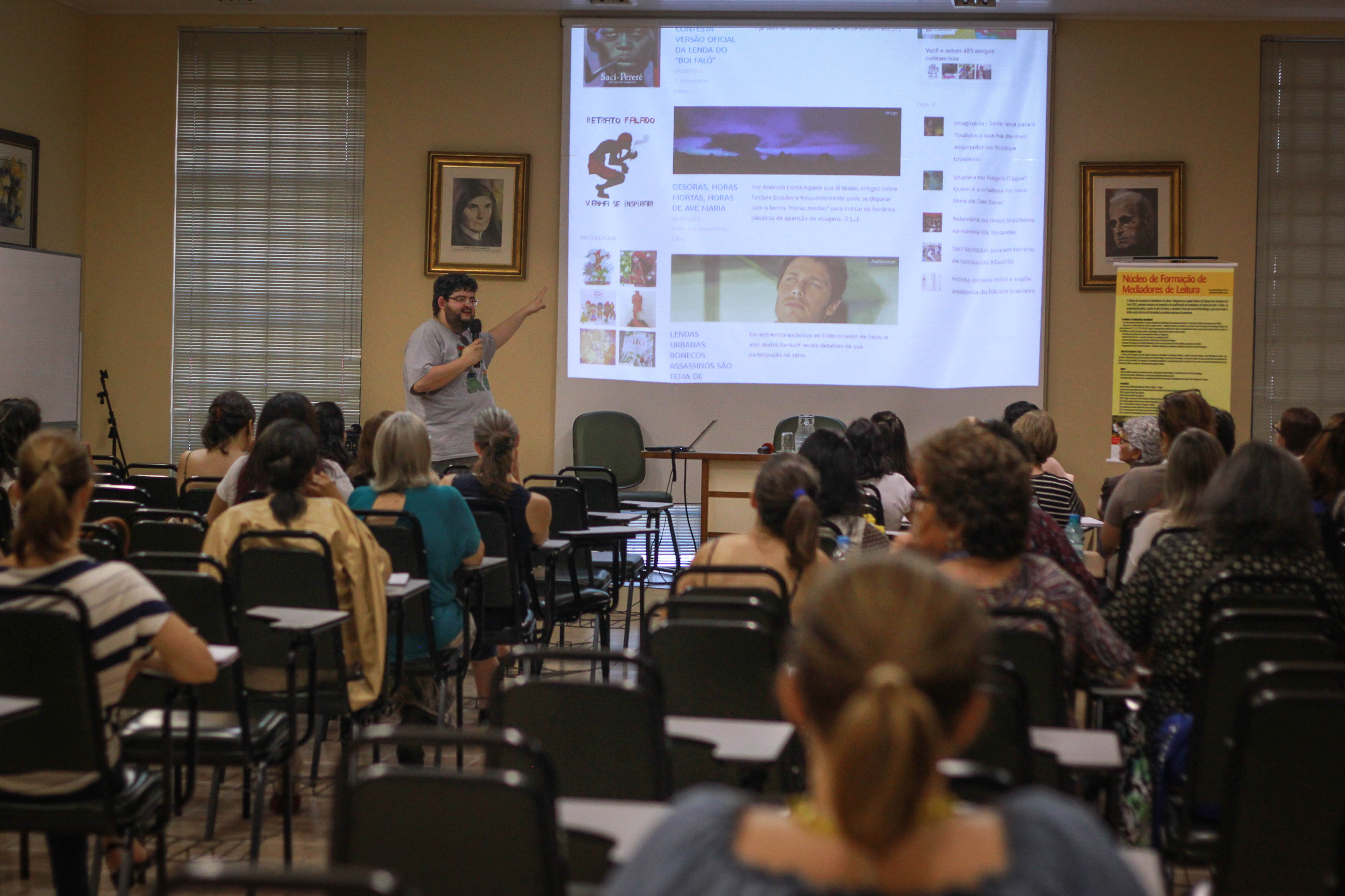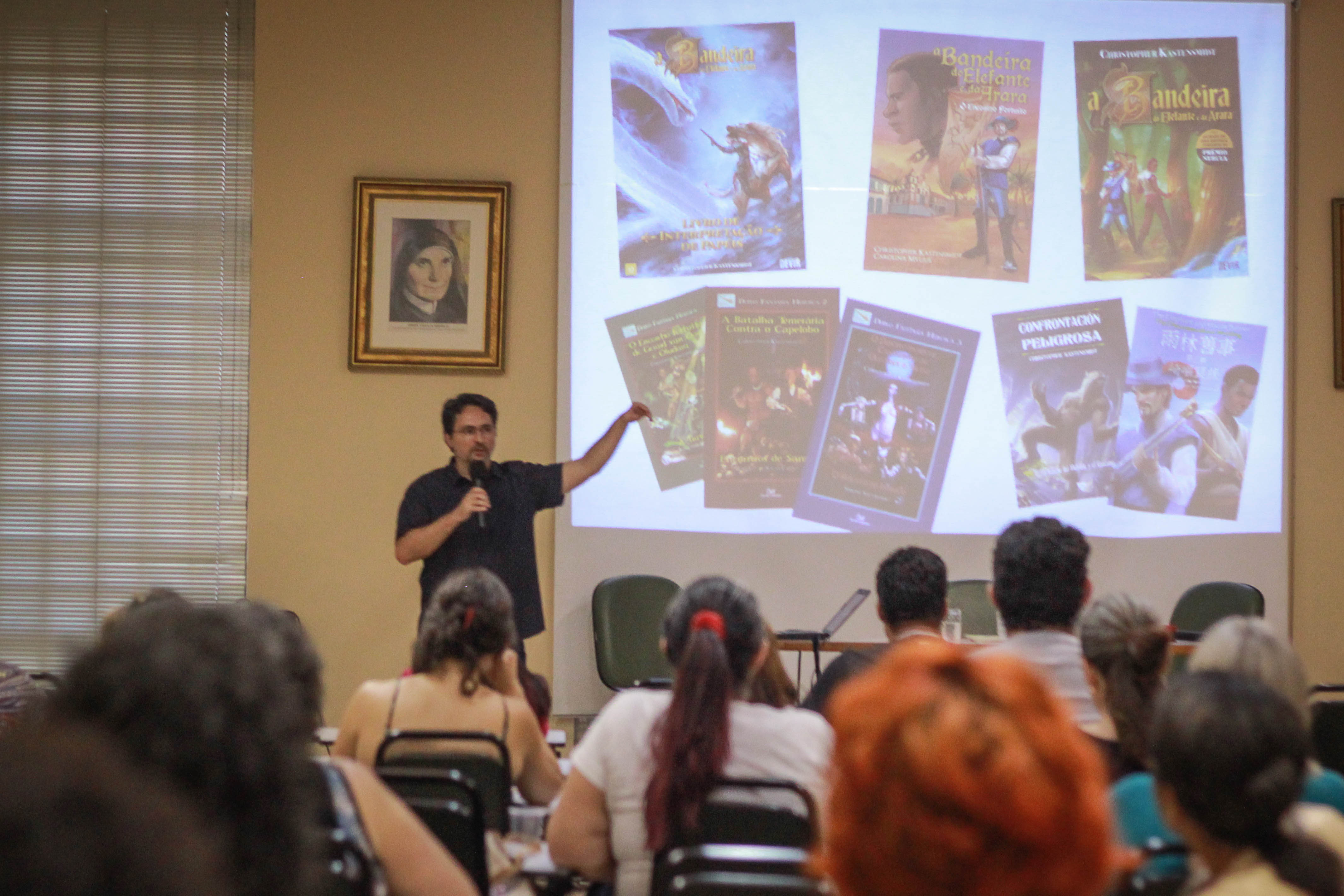 Minha apresentação foi a abertura para a aula ministrada pelo companheiro Christopher Kastensmidt, autor da série multimídia A Bandeira do Elefante e da Arara, que falou sobre literatura fantástica e ficção científica em sala de aula – com grande foco na indicações de autores nacionais da primeira até a quarta onda dessa produção.