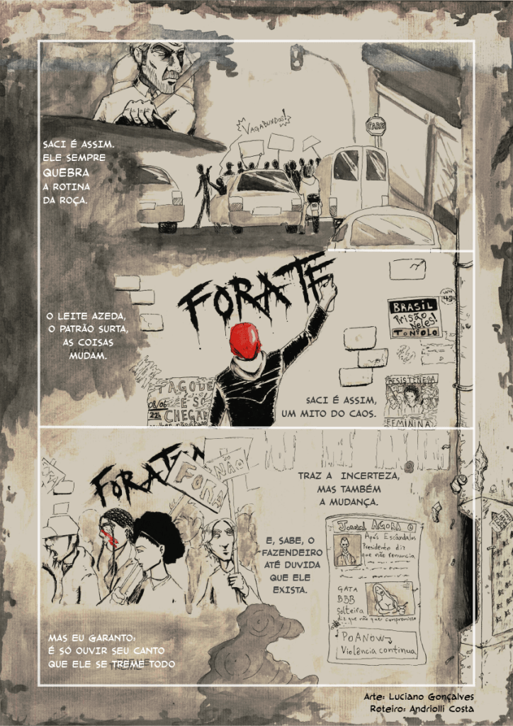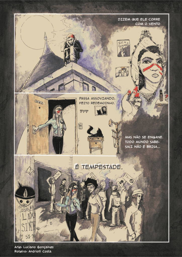 Em 2017 escrevi uma HQ de quatro páginas sobre o saci para um encontro na saudosa Galeria Hipotética, em Porto Alegre. A ideia era intercalar o texto folclórico com cenas do contemporâneo, mostrando que folclore tem tudo a ver com o social.