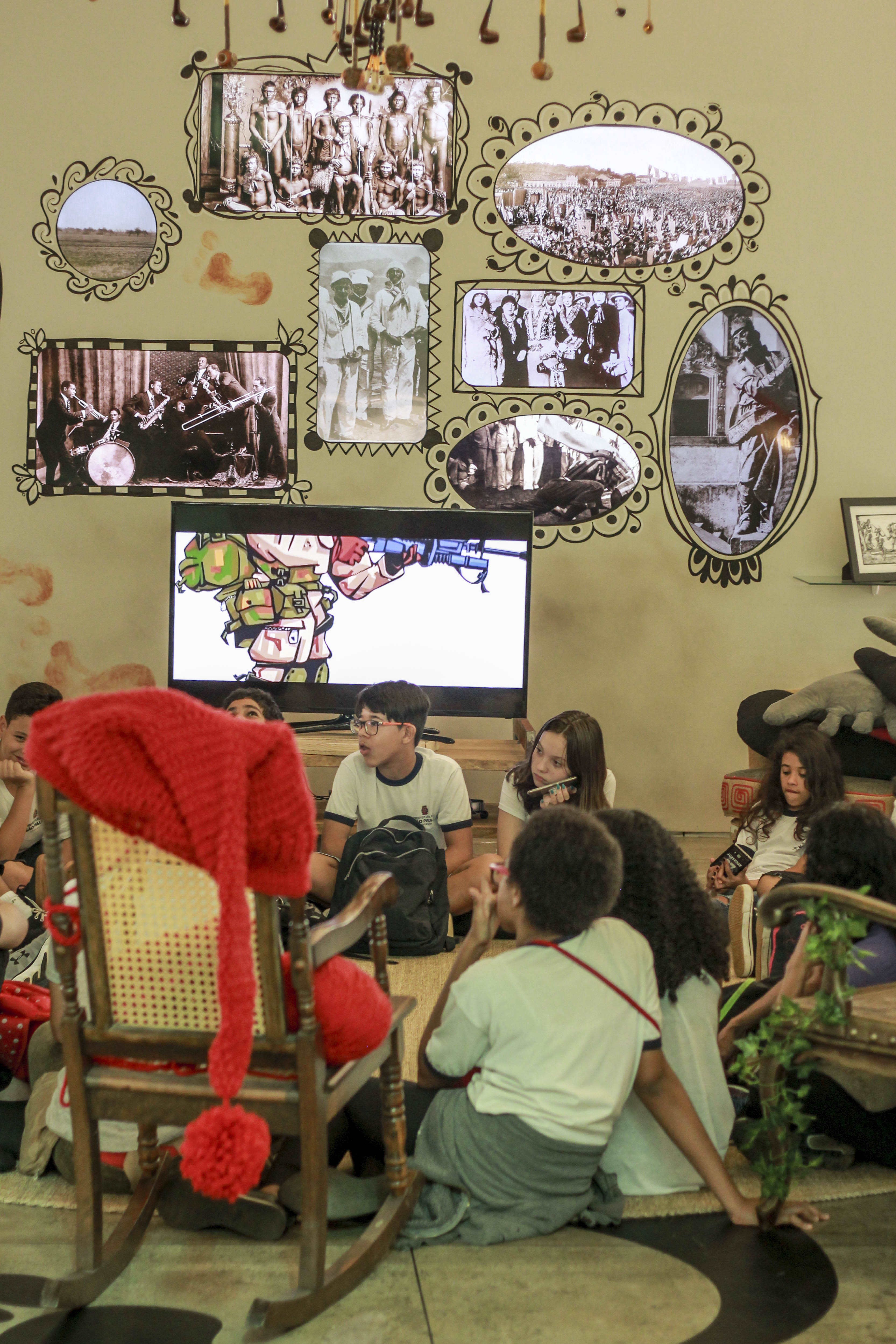 ocupasacy-10 Publicado em 06/05/2018 as 3331 × 4996 Na sala de estar, uma cadeira é reservada ao saci para que possa ouvir histórias também. Nas paredes, fotos históricas mostram o duende interagindo com suas personas. Uma TV exibe as animações da série Juro que Vi e o filme Somos Todos Sacys.
