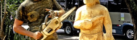 Rafael Mifano usa motosserra para esculpir o diabrete durante o mutirão do Movimento Boa Praça, no Alto da Lapa (SP)